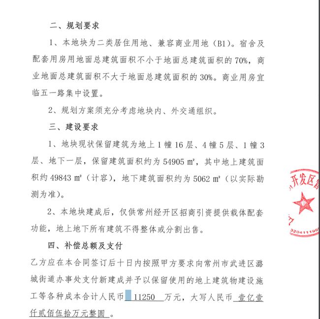 目前已在该地块新建成符合规划用途的宿舍及配套用房等建筑共6幢,建筑面积54905㎡ 该宿舍及配套用房需由乙方在后期对该地块开发建设中保留,无需重复建设。该地块成交后,竞得人还需支付11250万元。