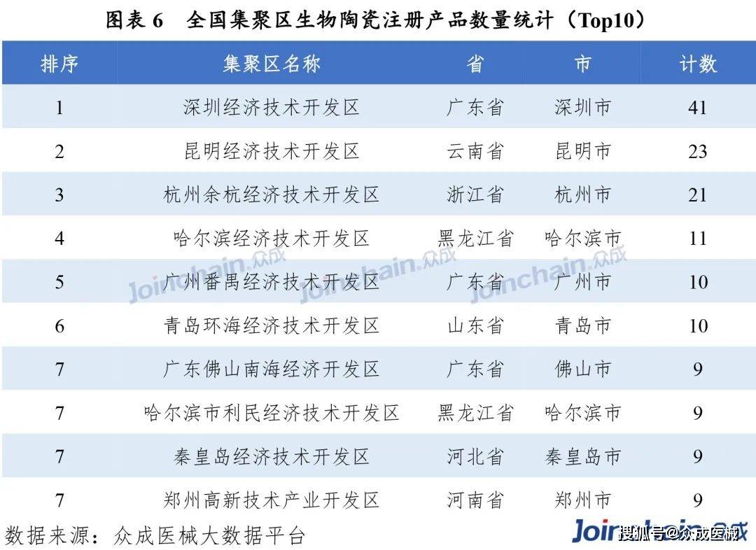全国生物陶瓷产业已在深圳、昆明、杭州、哈尔滨、广州等地形成特色集聚,其中深圳经济技术开发区注册产品数量41件。