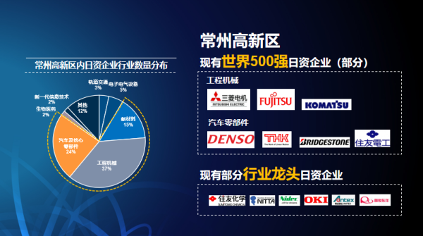 根据常州高新技术产业开发区公布的数据显示,累计注册成立日本企业超过150家,投资总额近30亿美元,主要集中在工程机械、车辆及零部件等行业,包括日本电装、蒂业技凯、普利司通、住友电工、三菱电机、富士通、小松等世界500强企业。